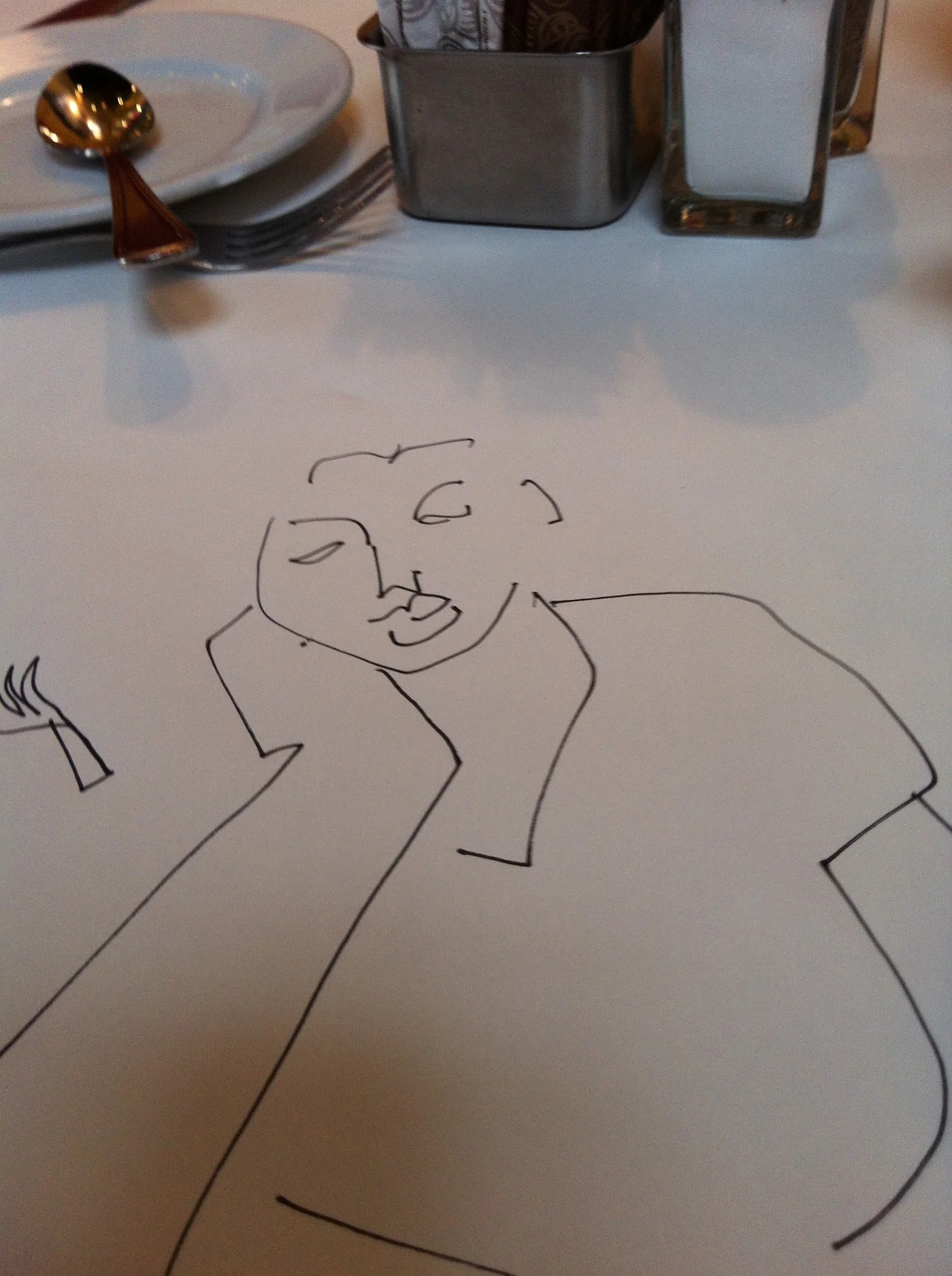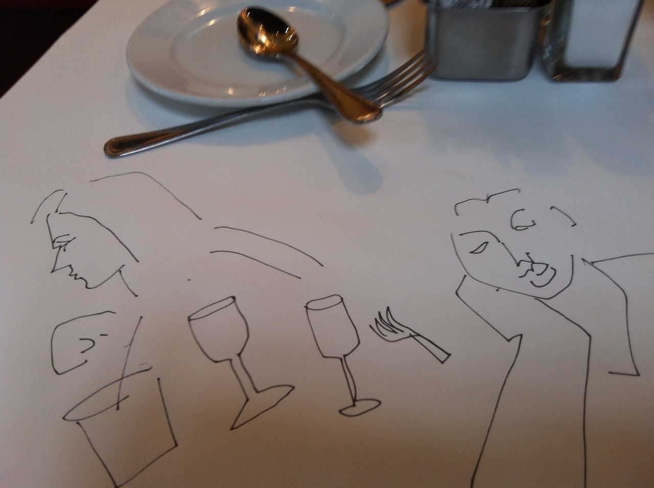 around the town, some of it with Kate. We eat in beverly Hills and I doodle all over the table. A few days earlier, at a baby shower we both draw and color objects for a baby’s first alphabet book. I can come up with some words, many are concepts. But Kate, with her concrete thinking, lists endless nouns, objects. One of her strengths I think.